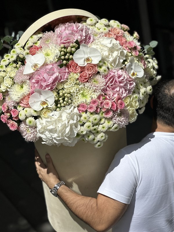 Bej renk kadife tasarım kutuda beyaz ve açık pembe tonlarında çiçekler ile hazırlanan aranjman yaklaşık 1 metre boyundadır.