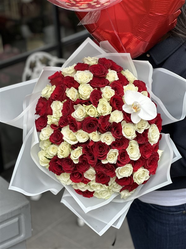100 adet ithal kırmızı ve beyaz güller ile hazırlanan dev boy gül buketi sevdiklerinize sıradışı bir çiçek alternatifidir.
