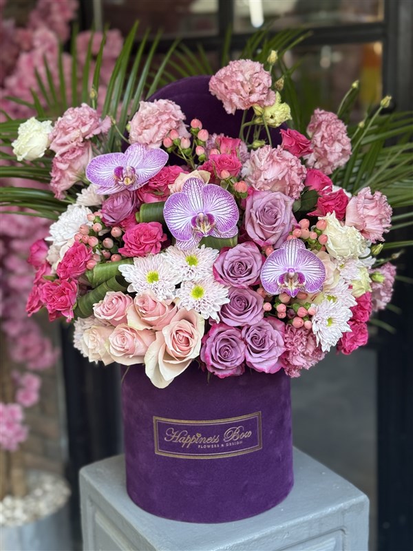 Mor kadife kutu içerisinde pembe ve mor tonlarında mevsim çiçekleri ile hazırlanan zarif flower box aranjmanıdır. Şık tasarımı ile özel günler için hazırlanır ve İstanbul’da aynı gün teslimat ile gönderilebilir.