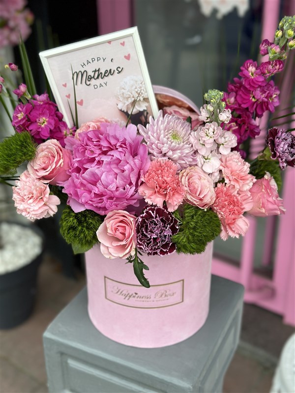 Anneler Gününe özel aranjmanımız Pembe kadife silindir kutuda Şakayık, Gül, Şebboy, Krizantem, Karanfil ve çeşitli mevsim çiçekleri ve özel kutlama mesajlı çerçeve ile hazırlanmaktadır.