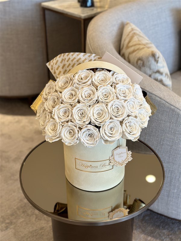 Bej Kadife Kutuda 24-25 adet Solmayan Beyaz Güller ile Hazırlanmaktadır.