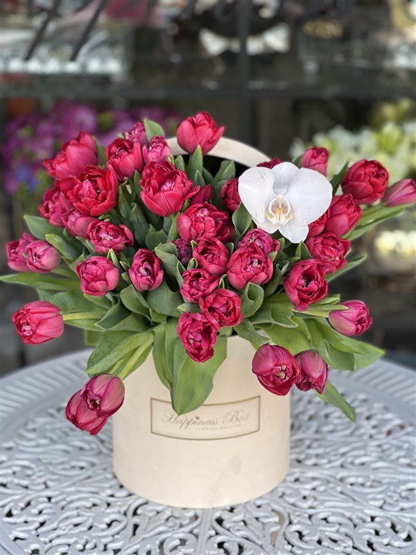 - Bej Renk Kadife Silindir Kutuda 40 adet Fuşya Renk Laleler ve Orkide Yaprağı İle Hazırlanmaktadır.