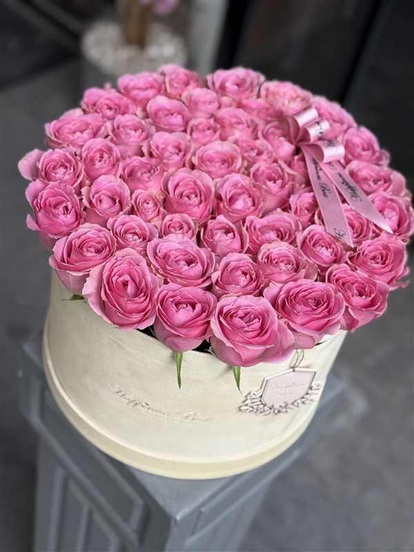 -Mega bej kadife silindir kutunun içinde yaklaşık 45-50 adet ithal Pembe Güller ile hazırlanmaktadır.