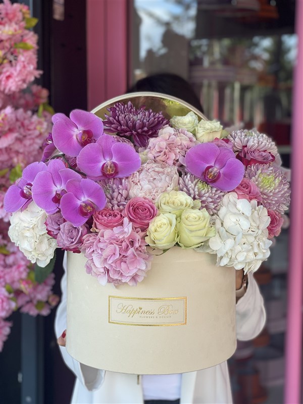 - Bej Kadife Mega Kutuda Pembe - Mor Tonlarında Taze Çiçekler İle Hazırlanmaktadır.