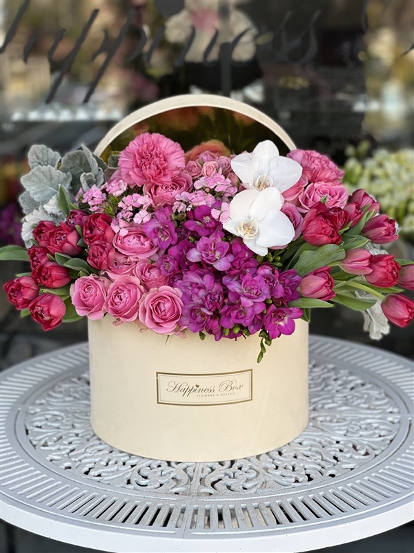 - Bej Kadife Mega Kutuda Pembe - Mor Tonlarında Taze Çiçekler İle Hazırlanmaktadır.