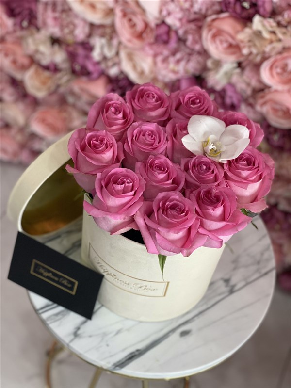 - Bej Silindir Kutunun İçinde yaklaşık 12-15 adet ithal iri kafa pember güller ile hazırlanır.