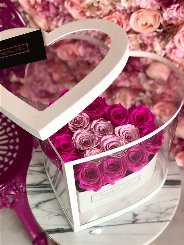 - Beyaz Kalp Asetat Kutuda 18 Adet Solmayan Gül ile hazırlanır.