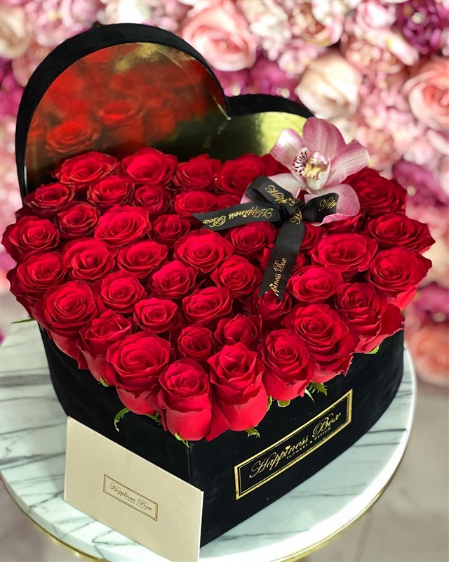 - Büyük boy siyah kadife kalpli kutunun içinde yaklaşık 50-60 adet ithal kırmızı güller ile hazırlanmaktadır.
