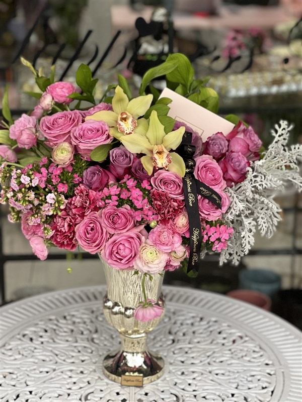- Büyük Gümüş Ayaklı Lüks Vazoda Pembe Tonlarında Aranjman