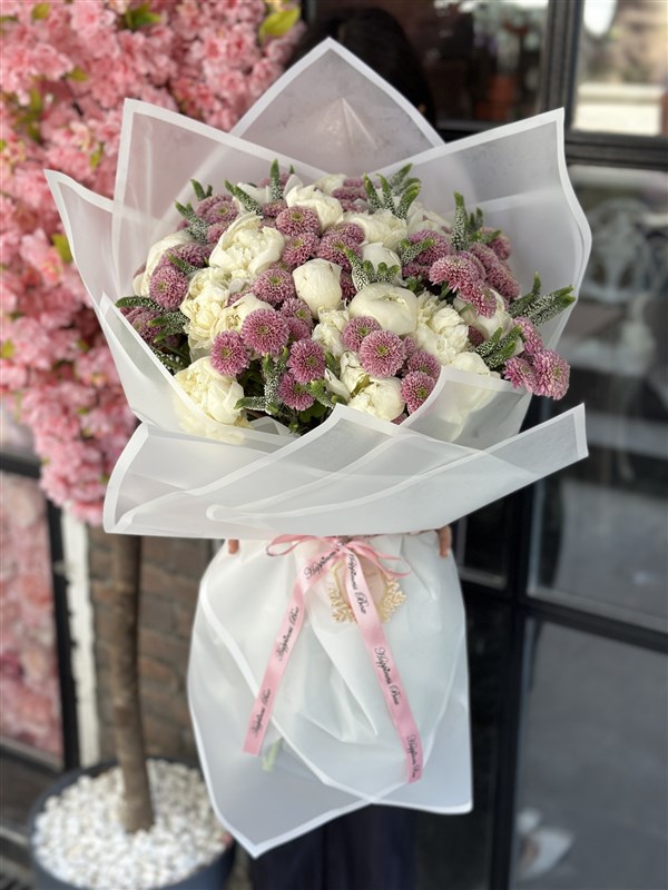 Deluxe Beyaz Şakayık Buketi 30 adet ithal beyaz şakayık ile hazırlanmaktadır.