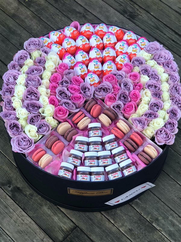 - 100-150 adet ithal pembe, lila, beyaz güller , çikolata ve macaronlar ile hazırlanır.