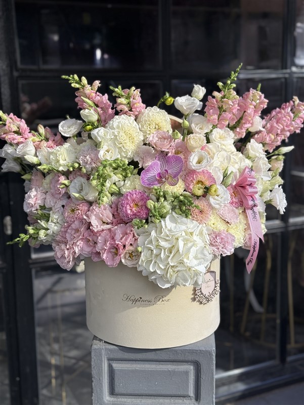 Bej kadife kutuda beyaz ve pembe tonlarında mevsim çiçekleri ile hazırlanmaktadır.
