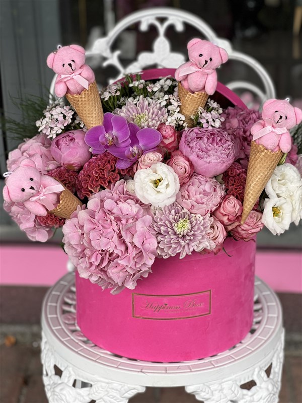- Fuşya Kadife Mega Kutuda Pembe Mevsim Çiçekleri, Ayıcıklar ve Külahlar ile Hazırlanmaktadır.