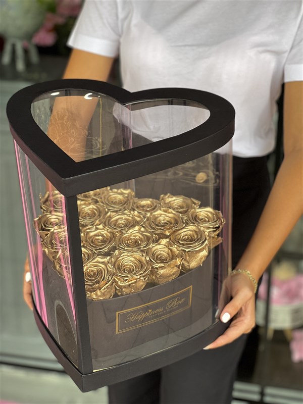 - Siyah Kalp Asetat Kutuda 18 adet İthal Solmayan Güller İle Hazırlanmaktadır.