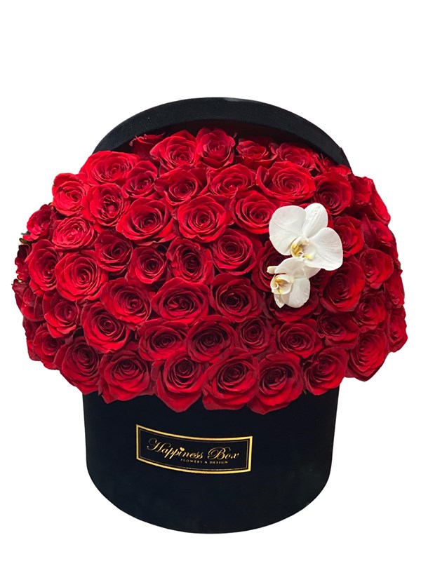 Grand Deluxe Kutuda Kırmızı Güller Tasarımı Siyah Kadife Mega Boy Kutuda Ortalama 80-100 adet Kırmızı Güller ile Bombeli Olarak Tasarlanmaktadır.