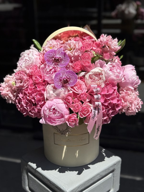 Krem renk kadife kutuda pembe şakayıklar, ortanca ve güller ile hazırlanmaktadır.