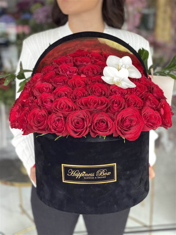 - Mega siyah kadife silindir kutunun içinde yaklaşık 60-70 adet ithal kırmızı güller ile hazırlanmaktadır.