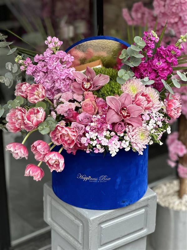 Mavi Kadife Mega Kutuda Pembe Laleler ve Pembe Tonlarında Mevsim Çiçekleri ile Hazırlanmaktadır.