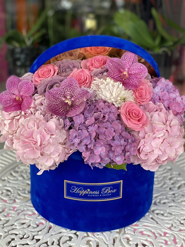 -Mavi Mega kadife silindir kutunun içinde Ortanca, Güller ve Orkide yaprakları ile hazırlanır.
