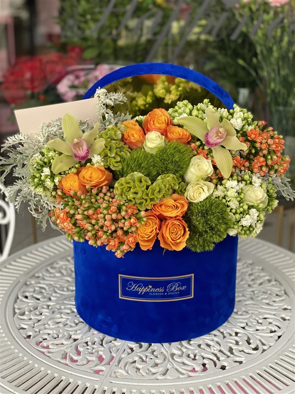 - Mavi Kadife Mega Kutuda Turuncu- Yeşil Tonlarında Aranjman.