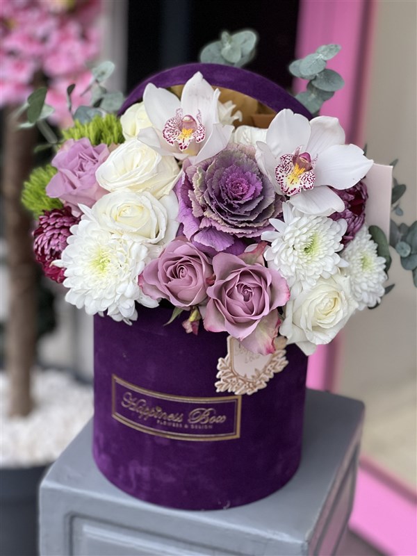 Mor Kadife Silindir Kutuda Lila - Beyaz Tonlarında Çiçekler ile Hazırlanmıştır.