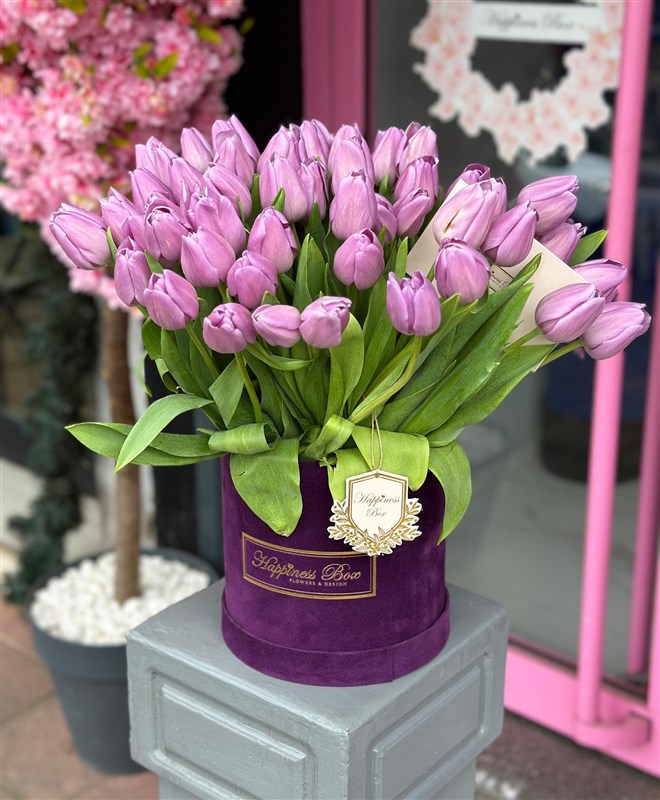 Mor kadife silindir kutuda 50 adet ithal lila renk lale ile hazırlanmaktadır.