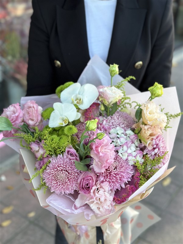 Buket içerisinde Pembe - Yeşil tonlarında çeşitli mevsim çiçekleri kullanılmaktadır.