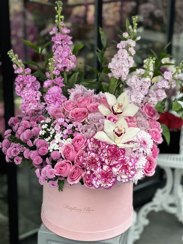 Pembe mega boy kadife kutuda pembe - mor renklerinde mevsim çiçekleri ile hazırlanmaktadır. Dev Boy bir aranjmandır.