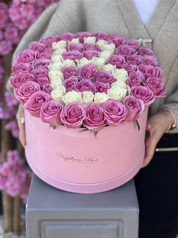 -Mega pembe kadife silindir kutunun içinde yaklaşık 45-50 adet ithal Pembe Güller ile hazırlanmaktadır.