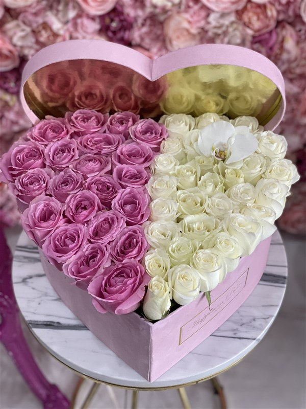 - Büyük boy kalpli kutunun yarısı pembe yarısı beyaz güller ile hazırlanır. Yaklaşık 45-55 adet ithal gül kullanılmaktadır.