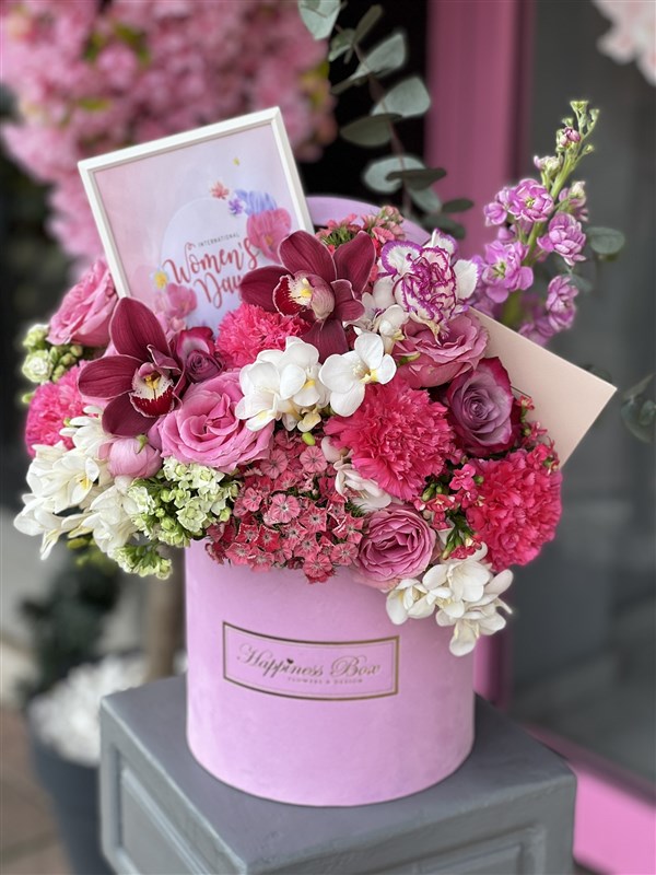 - Pembe Kadife Kutuda Pembe İthal Güller, Frezyalar ve çeşitli taze çiçekler ile hazırlanmaktadır.