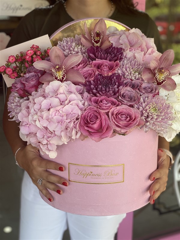 - Pembe Mega kadife silindir kutunun içinde Ortanca, Güller, Krizantem ve Vanda Orkide yaprakları ile hazırlanır.