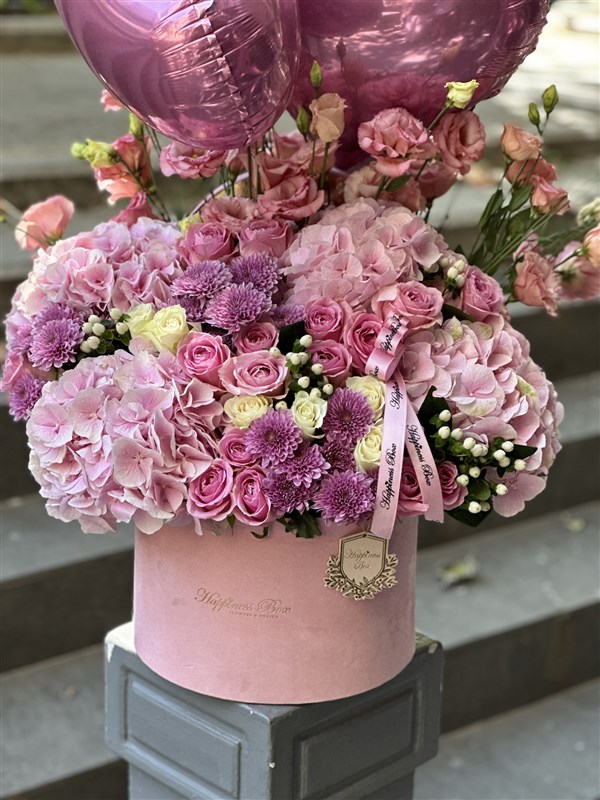 Pembe Kadife Mega Boy Kutuda Pembe Ortancalar, Pembe Güller ve Çeşitli Mevsim Çiçekleri ile Hazırlanmaktadır.