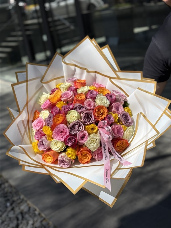 Rengarek güller ile hazırlanan gökkuşağı buketimizde 60 adet ithal gül kullanılmaktadır.