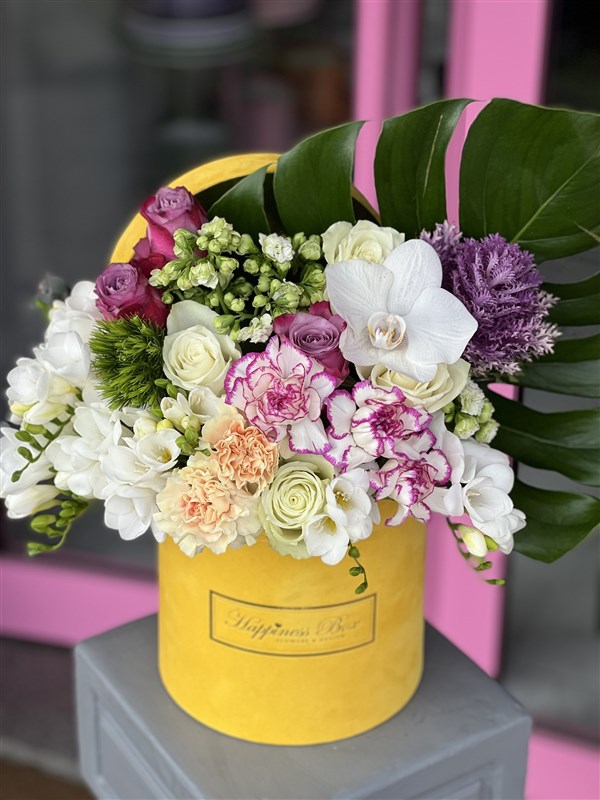 - Sarı Kadife Kutuda Mor İthal Güller, Frezyalar ve çeşitli taze çiçekler ilehazırlanmaktadır.