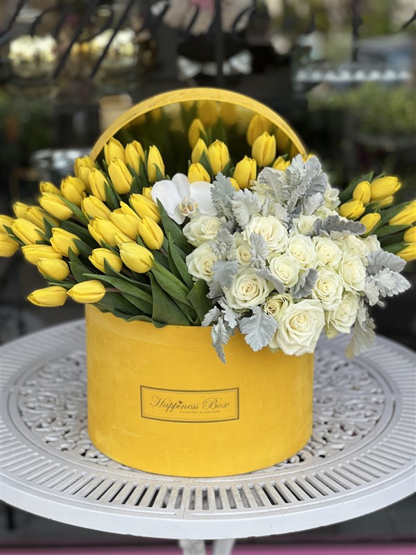 - Sarı Mega Boy Kadife Silindir Kutuda 50 adet Sarı Lale ve Beyaz Güler ile Aranjman Olarak Hazırlanmaktadır.