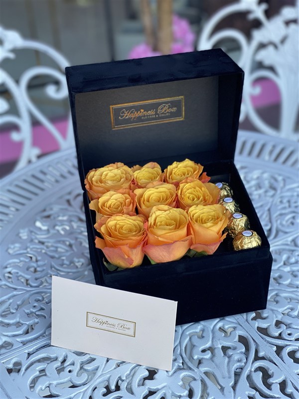 - Siyah Dikdörtgen Kadife Kutuda 9 adet Turuncu İthal Canlı Güller ve 4 adet çikolatalar mevcuttur.