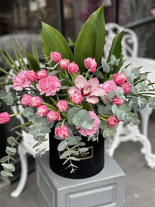 Siyah Kadife Kutuda Pembe Laleler ile Hazırlanmaktadır.