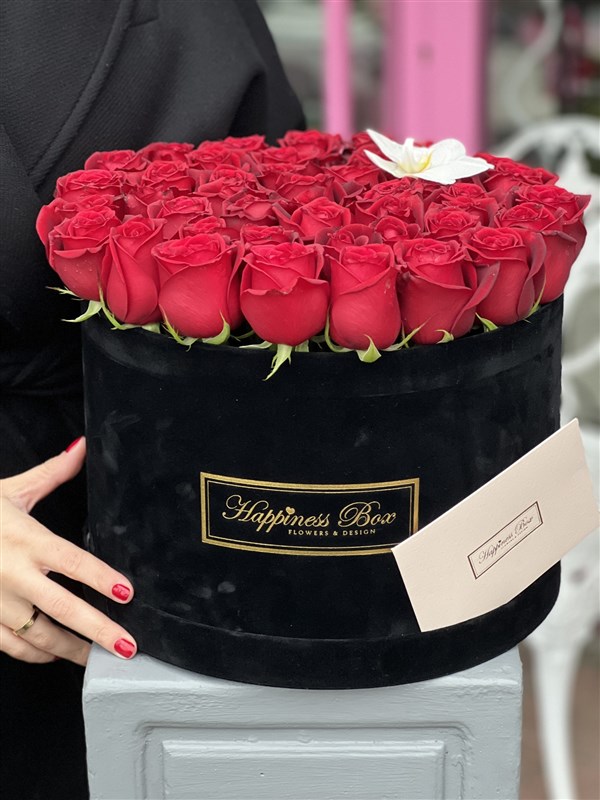- Siyah Mega Kadife Silindir Kutuda Yaklaşık Olarak 40-45 adet İthal İri Kafa Canlı Kırmızı Güller İle Hazırlanmıştır.
