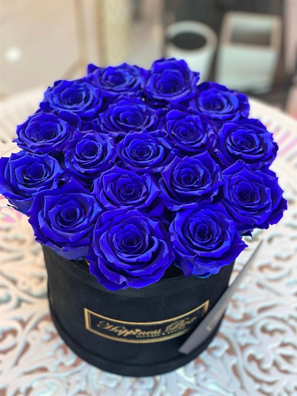 - Siyah Silindir Kutuda 18 adet mavi solmayan ekvator gülleri ile hazırlanmaktadır.