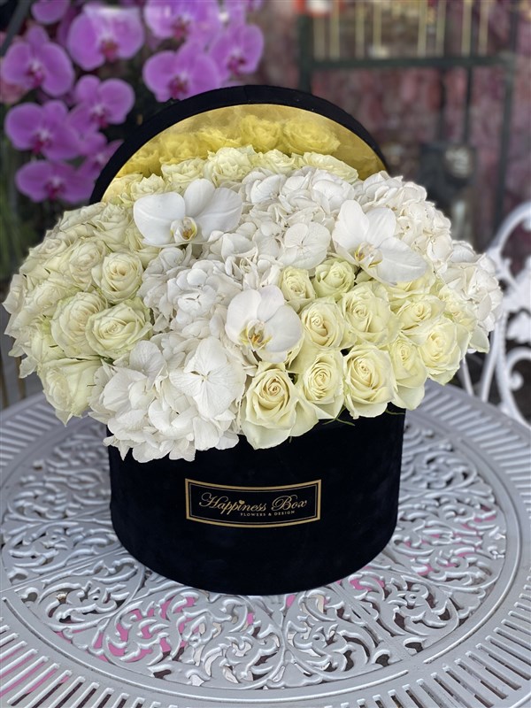 - Siyah mega kadife silindir kutunun içinde Ortanca, Güller ve Orkide yaprakları ile hazırlanır.