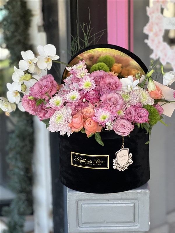 Siyah Lüks Mega Kutuda Pembe Tonlarında Lisianthus, Anastasia, Güller ve Orkideler ile Hazırlanmaktadır. Aranjmanın Ölçüleri 50x30 cm dir.