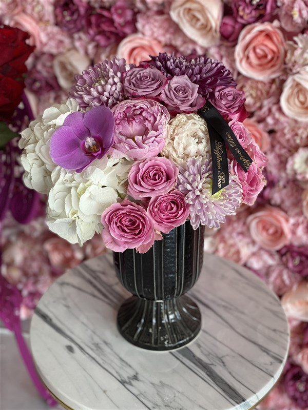 - Siyah Ayaklı Lüks Vazoda Pembe Tonlarında Aranjman ile Baharın Gelişini Hissedin.