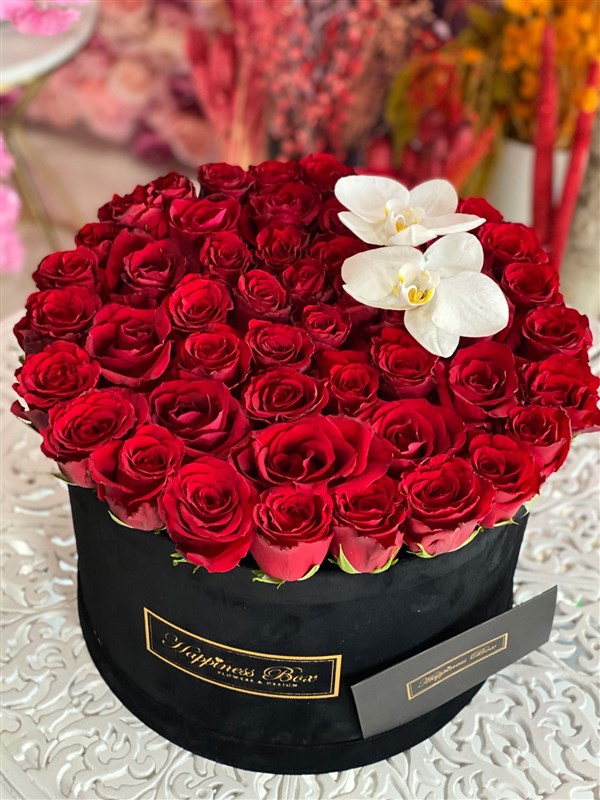 -Mega siyah kadife silindir kutunun içinde yaklaşık 35-40 adet ithal Kırmızı Güller ve orkide yaprağı ile hazırlanmaktadır
