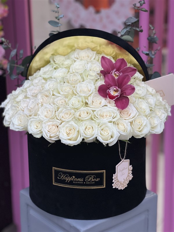 - Siyah Kadife Mega Kutuda yaklaşık 70-80 adet canlı ithal beyaz güller kullanılmıştır.