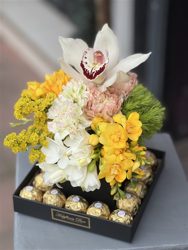 Kare Asetat Tasarım Kutumuz Renkli Mevsim Çiçekleri ve Ferrero Rocher İthal Çikolata ile Hazırlanmaktadır.